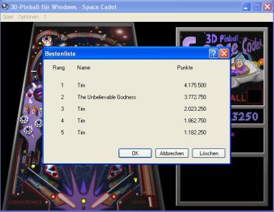 Wir ihr ja alle wisst hat man Zeit muss man sie sich ja irgendwie vertreiben,oder besser noch wie mein Freund stefan zu sagen pflegt, aktiv totschlagen. Nun gut, wir sind also dabei uns im ULTIMATIVEN FLIPPERCONTEST zu duellieren. Zu meiner Schande muss ich gestehen das ich, Spielername "Gott" , grad leicht hinten. Allerdings muss ich sagen das fantastisch vorgelegt hab und der , na sagen wir mal , Mitbewerber auf Platz 1 hart zu tun hatte. Nun fehlt mir allerdings grad die Muse den Misthighscore von Tim zu knacken. Aber nächste woche fällt das Ding, versprochen!!